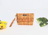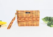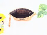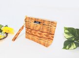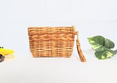 藤カゴ風柄(リアルプリント)の綿キャンパス地の明るい持ち手付きポーチです。