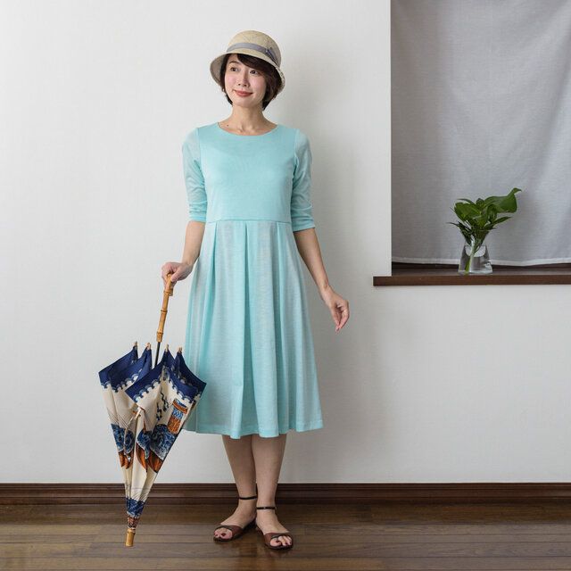 ┗ポケットやファスナー、ボタンなど余計な装飾を一切はぶき、シンプルを極めたワンピースです。その分小物やアクセサリー、着る人を引き立てます。