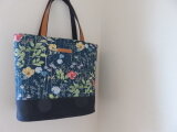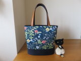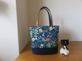 リバティ 紺色イルマとバイオウオッシュ8号帆布で楕円底のバッグを作りました。