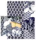 男物の割付文様と白地に花や麻の葉、波文様の2種類の浴衣から