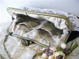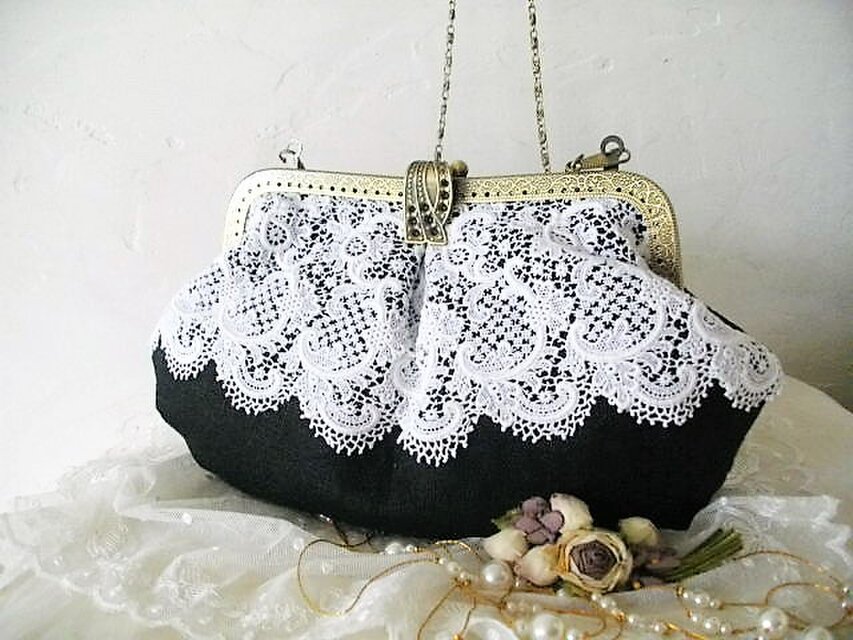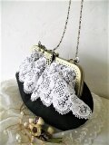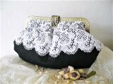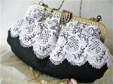 黒リネンにアンティークギュピールレースをのせたがま口バッグ