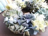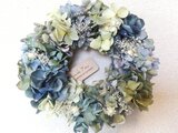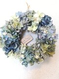 ブルー、ライトブルー、ネイビーブルーなどのあじさいと、かすみ草、アンモビユームのボリュームのあるナチュラルなリースです。