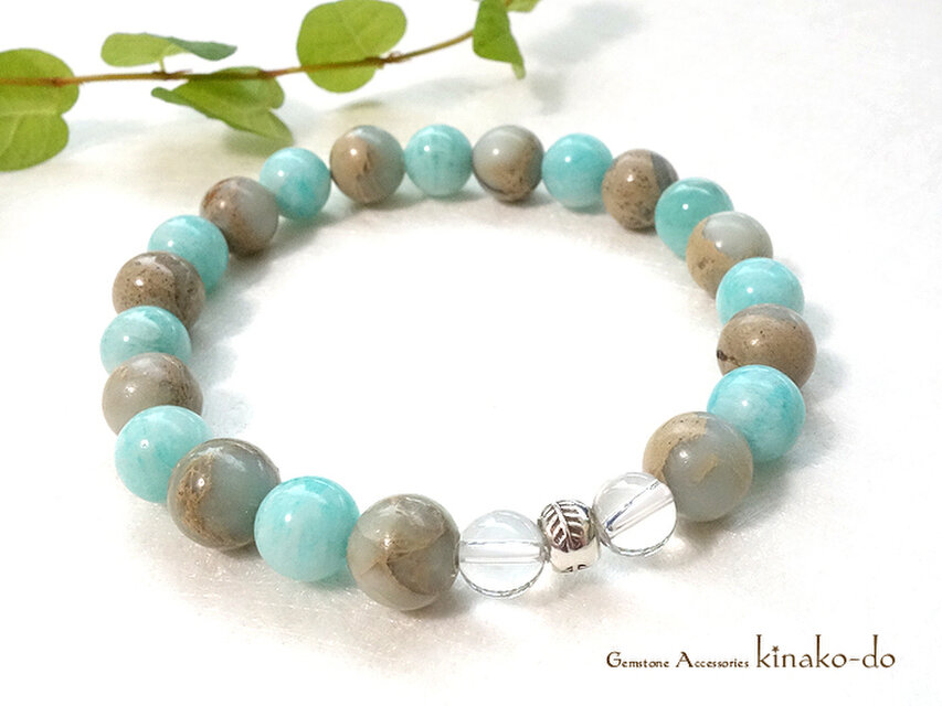 リーフ模様がほどこされたカレンシルバーと天然水晶をアクセントに、爽やかなブルーグリーンに白い模様が浮かぶアマゾナイトと大地のような味わいのある色合いのインプレッションストーンを組み合わせたナチュラルな雰囲気のブレスレットです。