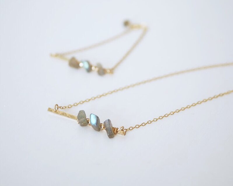 14kgfの槌目模様の入ったバーに、シラーの綺麗なラブラドライトを飾りました。