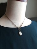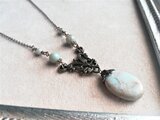 淡いミルクグリーンに黄土色の大理石風の模様がとてもきれいな、インプレッションストーンを、素敵なデザインのコネクターに下げました。