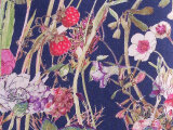 『英国の花図鑑』のイラストから着想を得てデザインされた柄です。繊細なタッチの植物画がデジタルプリントで写実的に表現されています。生地の地の色がネイビー、花の色がパープル、オフホワイト、ピンク、レッドなど。葉の色が濃淡のあるグリーンです。