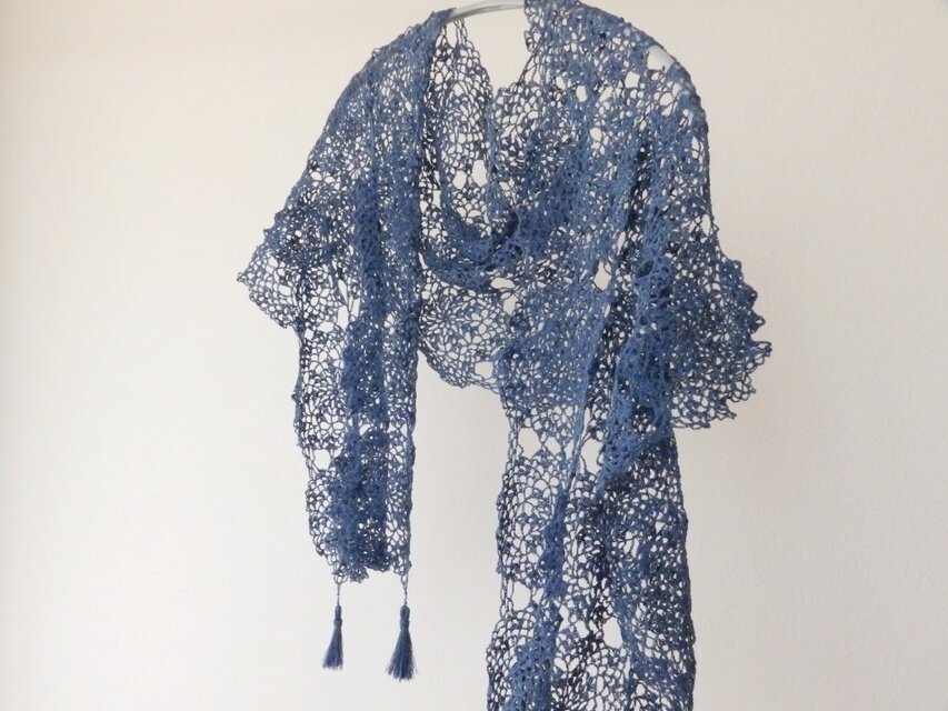 極細の麻(ラミー100%)の糸をかぎ針で丹念にモチーフを繋げて編んだストールです。