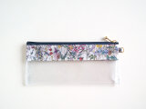 リバティの人気生地、(ビニールコーティングつや無)、 ワイルドフラワーズ Wild Flowers(ホワイト)で開けなくても中身が見える便利なクリアポーチ(横長)を作りました。