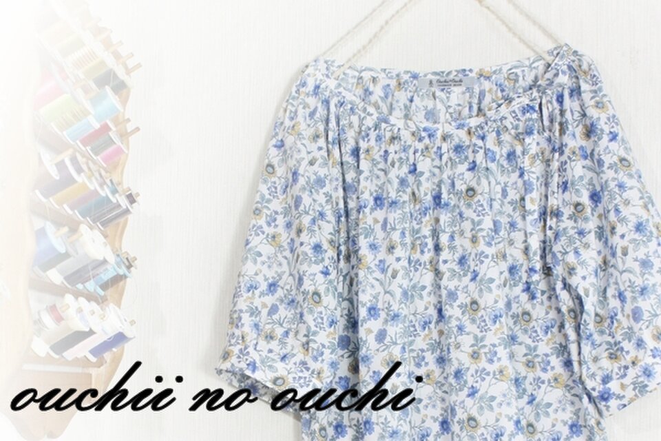 リバティ・タナローン ホビーラ限定 2019年春夏柄 Tiger Lily タイガーリリー ブルー系で左あきリボンのボートネックギャザーブラウスを作りました。