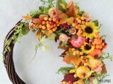 かぼちゃや実もの、ミニ向日葵などを入れて夏から秋へと向かう色合いのリースに仕上げました。