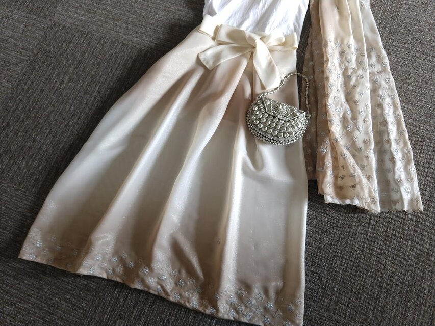 ★インドサリーのセット★ベージュ×銀糸★ギャザースカート+ショール★受注製作★