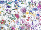 『英国の花図鑑』のイラストから着想を得てデザインされた柄です。繊細なタッチの植物画がデジタルプリントで写実的に表現されています。生地の地の色がホワイト、花の色がマゼンタピンク、ブルー、イエロー、レッドなど。葉の色が濃淡のあるグリーンです。