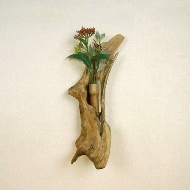 流木の隙間に竹の流木を取り付けて、吊り金具を付けて一輪挿しに仕上げました。