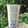 半磁器表面に、青や緑をグラデーションで塗り重ね、 模様だけ残して削りました。
