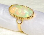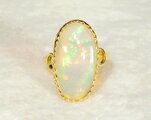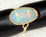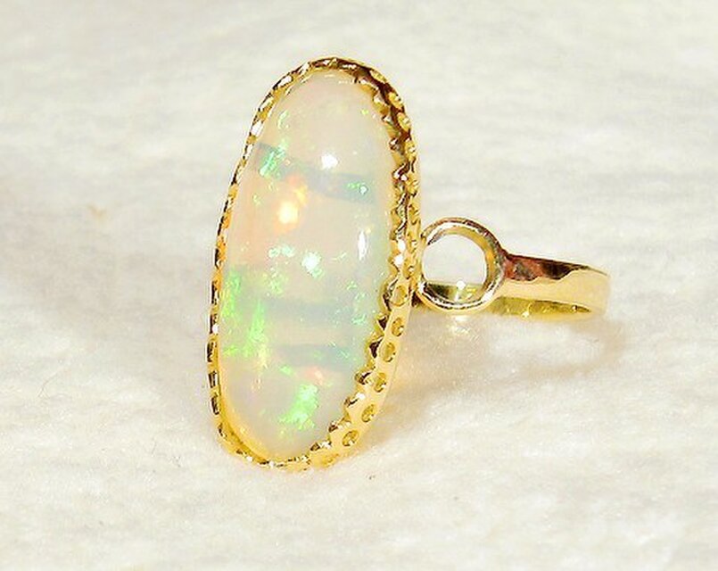 5カラットの大きく、水色の綺麗な透明感を持つウォーターオパール(5.01ct)を使った指輪です。遊色効果の鮮やかな赤や緑が全面に浮かびます。