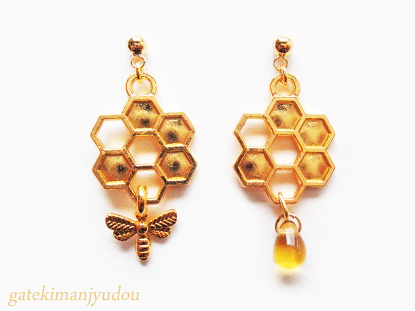 蜂の巣の下に蜂モチーフが揺れるピアスと蜂蜜に見立てた雫型のチェコビーズが揺れるピアスのセットです。