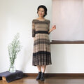 ・薄手で伸びの良い素材。ウエスト部分にベルトのように見える黒のラインがくるので、ほっそりと着やせ効果があります。小さくまとめてもシワにならないタイプなので、春から初冬まで、旅行にも活躍してくれます。
