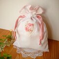 薔薇のアップリケ♪Wガーゼの巾着袋 ピンク
