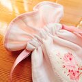 ♥ふわふわで気持ちいいダブルガーゼにバラのアップリケを施した心ときめく巾着袋です(*^-^*)