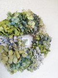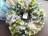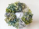 ブルー、ライトブルー、グリーンなどの味わいのある色合いのあじさいと、かすみ草のボリュームのあるナチュラルなリースです。