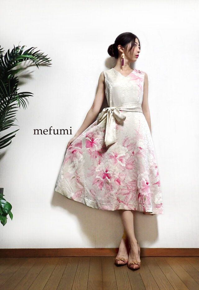 繊細で美しく優美な花々で彩られた素敵なアンティーク羽織をほどいて、フォーマルワンピースをお作りいたしました。