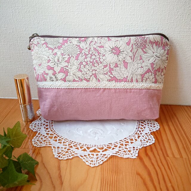 ♥大人ピンクのリネン生地にリバティのタナローンを重ねたポーチです(*^-^*)