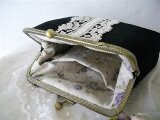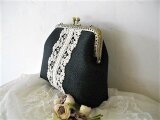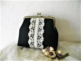 黒リネンにアンティークレースをのせたがま口ポーチ