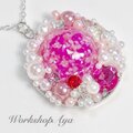 ピンクのラメを封じ込めた美しいヘミスフィア(半球)を中心に、クリスタル、ホワイト、ピンクのビジューやスワロフスキー、パールなどを効果的に配しています。