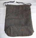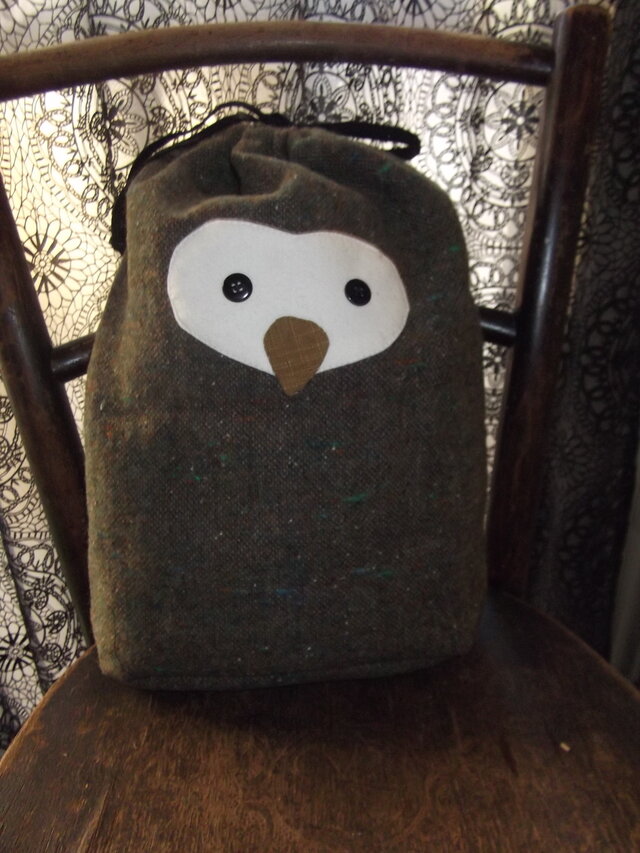 ツィード地にフクロウの顔をアップリケした巾着型のバッグです。