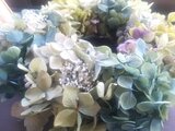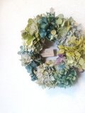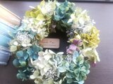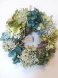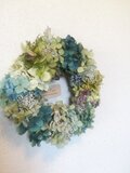 ブルー、ライトブルー、グリーン、ライトグリーンパープルなどの味わい深い色合いのあじさいと、かすみ草のボリュームのあるナチュラルなリースです?