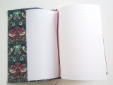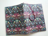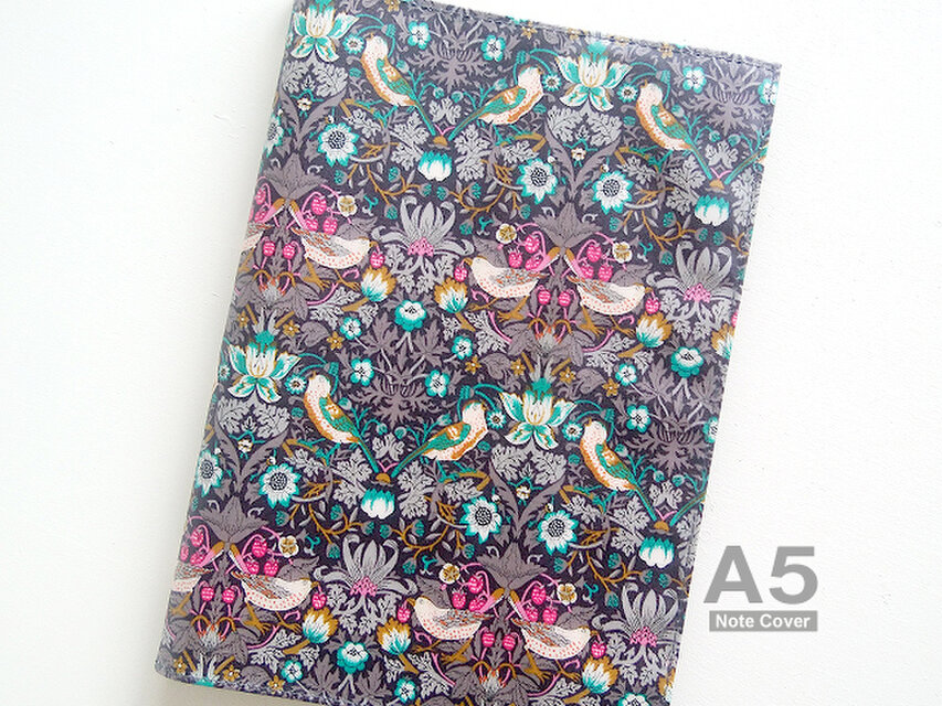 リバティの人気生地、Strawbery Thief ストロベリーシーフ(ダークブラウン)のラミネート生地(つや無)でA5サイズのノートカバーを作りました。