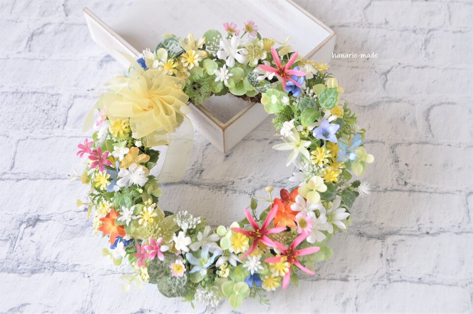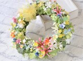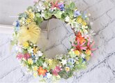 リース素材:アーティフィシャルフラワ-(造花):アストランティア・レースフラワー・デージー・アジサイ・小花・ユーカリ、など。その他:黄色のオーガンジーリボン飾り(取り外しできません)、など。