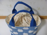 外側はねこたま柄の帆布と8号帆布のコンビ、内側は生成りのキルティングを使っております。