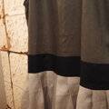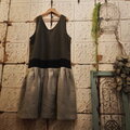 カーキ、ブラック、グレーリネンの組み合わせのジャンバースカート風ゆったりワンピースです。