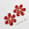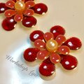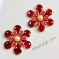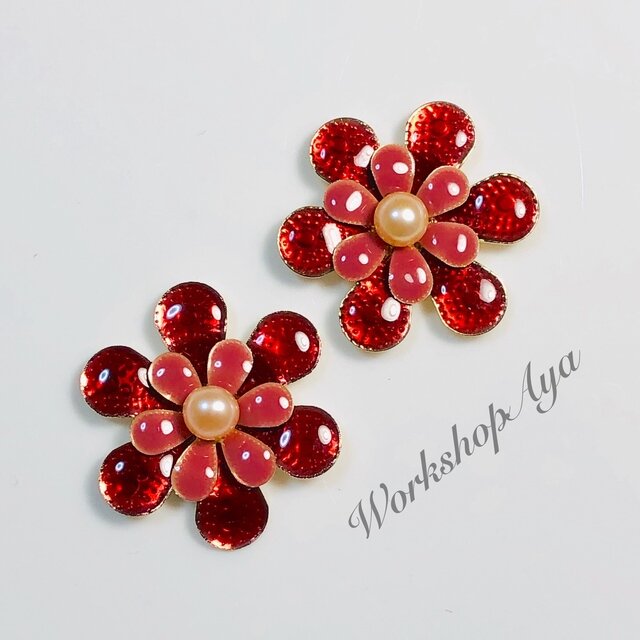 光沢のある大きなお花モチーフの中心に、サーモンピンクの淡水パールを配し、秋冬向けのおしゃれなピアス(イヤリング)を仕立てました。