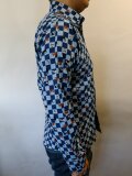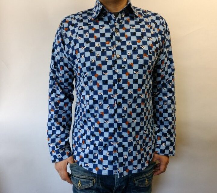 新作手作り長袖和柄シャツ(市松文様に猫)