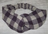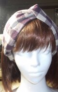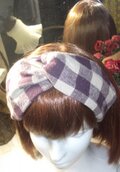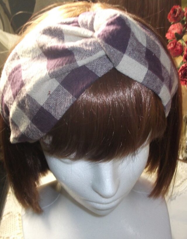 ざっくりした厚手の麻のクロスしたヘアバンドです。紫の大きな格子柄です。