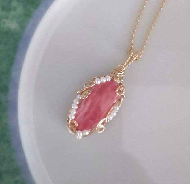 優しく美しい色合いのインカローズ(別名ロードクロサイト)を上品な14金ゴールドフィルドワイヤーでラッピングしました。