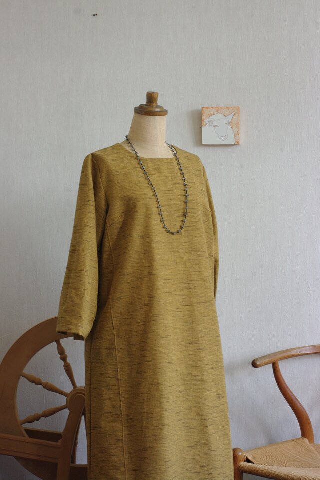 カラシ色の久留米絣でワンピースを作りました。