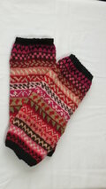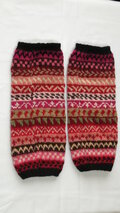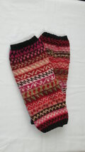 100色の毛糸から選んで一針一針編んだ、カラフルなフェアアイルのレッグウォーマーです。