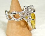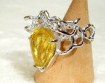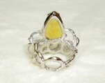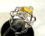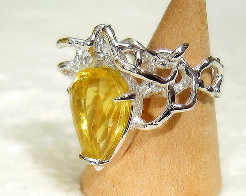きれいなイエローのフローライトを使った指輪です。ロストワックス(専用のロウで枠の原型を作り、その形通りに鋳造する製法)で作った、曲線的で個性のあるオリジナルの枠を使っています。