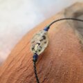 サイズ調整のビーズは、青~青緑のインドパシフィックを選び、繊細な黒い紐でつなぎました。
