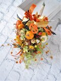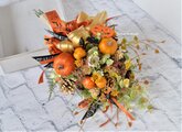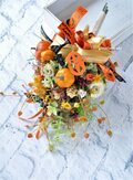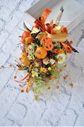 オレンジ色のパンプキンに ナチュラルカラーの松かさやワタカラを 束ねています