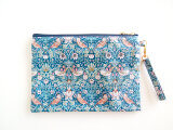 リバティの人気生地、(ビニールコーティングつや無)、Strawbery Thief ストロベリーシーフ(ブルーグリーン)便利なWファスナーのフロントクリアポーチ(B6サイズ)を作りました。