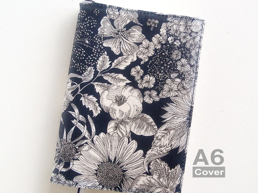 リバティの人気生地、 Swim Dunclare スイム・ダンクレア(ネイビー)のラミネート生地(つや無)でほぼ日手帳 オリジナル (A6 文庫サイズ)の手帳カバーを作りました。