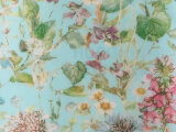 『英国の花図鑑』のイラストから着想を得てデザインされた柄です。繊細なタッチの植物画がデジタルプリントで写実的に表現されています。生地の地の色がライトブルー、花の色がピンク、ブルー、イエロー、オフホワイトなどです。葉の色が濃淡のあるライトグリーンです。