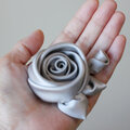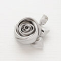 シルクの光沢が美しいバラのコサージュです。なめらかに反射するシルバーの上質な国産シルクサテンを使用しています。やわらかいフォルムに上品な色合いのシルクコサージュは、パーティーや入学式、卒業式などのフォーマルな場面で活躍します。