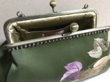 がまぐちバッグ・角型口金 抹茶色 ぶどうの葉 刺繍帯地バッグ