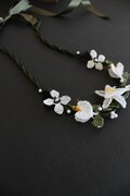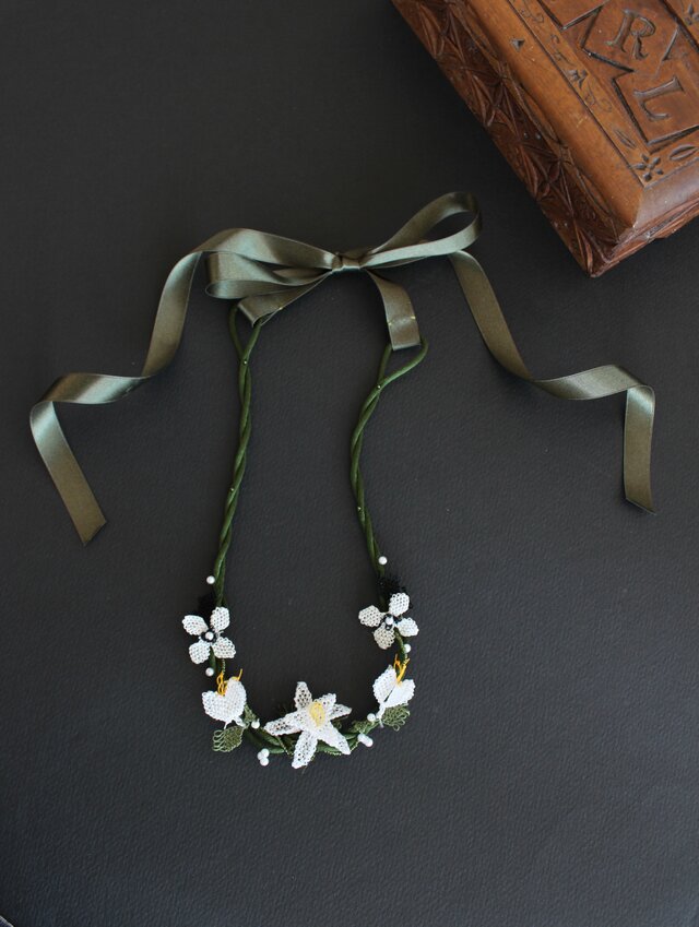トルコから取り寄せたいろいろなイーネオヤのなかから ホワイト系のイーネオヤのノスタルジックな繊細さが引き立つようにデザインしたお花のネックレスです。