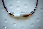 アゲートの両サイドには琥珀やアメジスト、ゴールドやシルバーのビーズを添わせました。小さな琥珀の澄んだ飴色がさし色になっています。